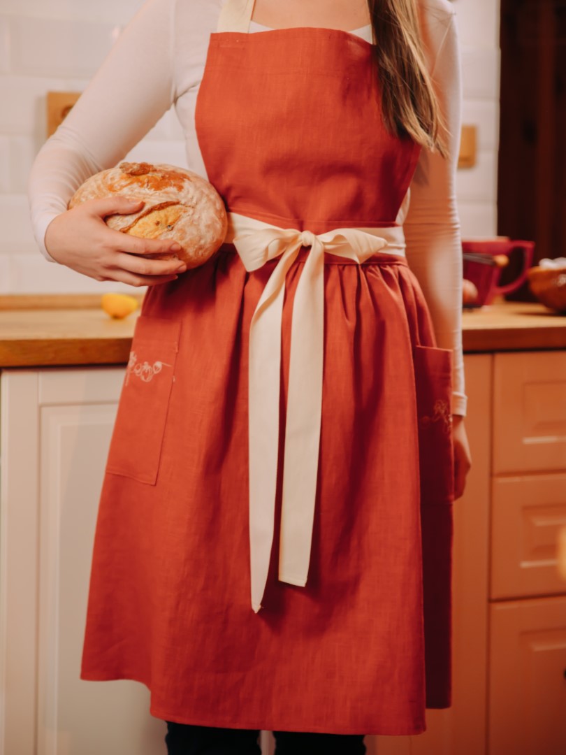 Dámska ľanová zástera s výšivkou a dlhým viazaním z keprovej stuhy, ktorá dodáva tejto zásterke ľahkosť.